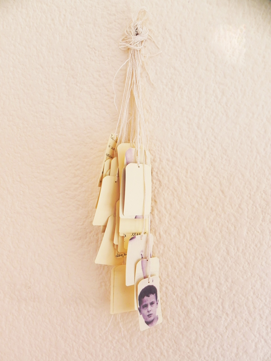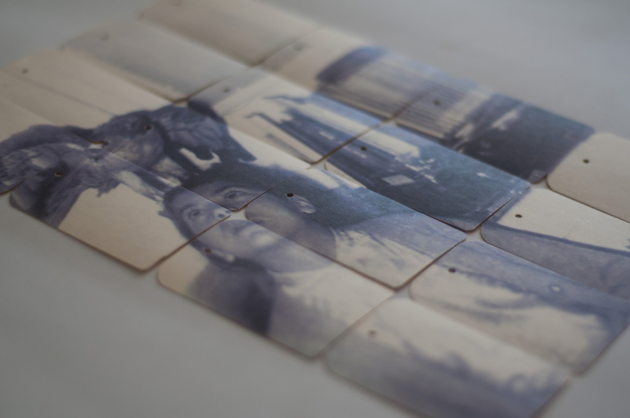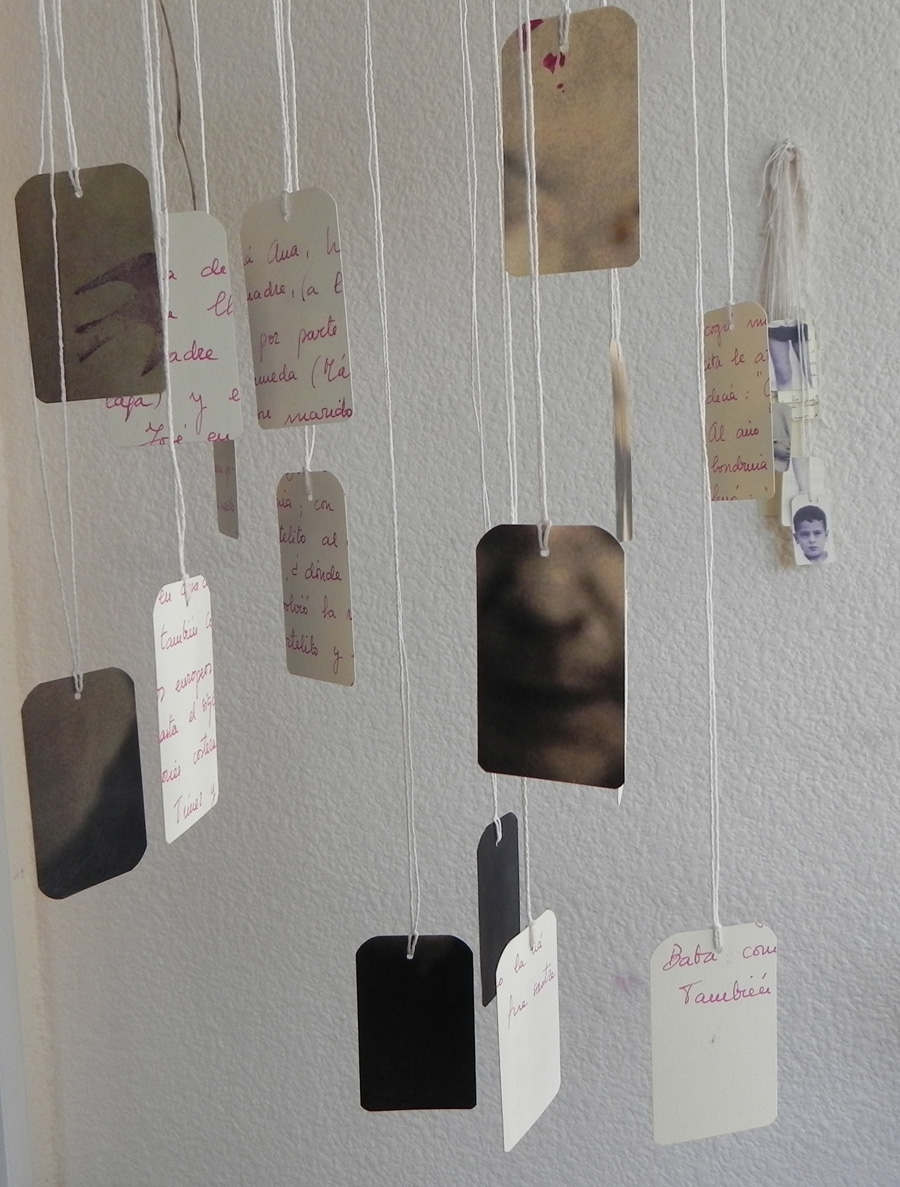 Cada imagen, con su historia respectiva en el reverso, la he dividido en 16 partes y las he transformado en etiquetas que cuelgan de un nido con una cuerdecita. Así para poder apreciar la imagen completa y leer su historia hay que reunir todas las partes a modo de puzzle. Una vez más en mi obra aparece la dualidad de querer mostrar mi vida, mis recuerdos pero al mismo tiempo tiendo a ocultarlos, siento cierto pudor al "descubrirme".