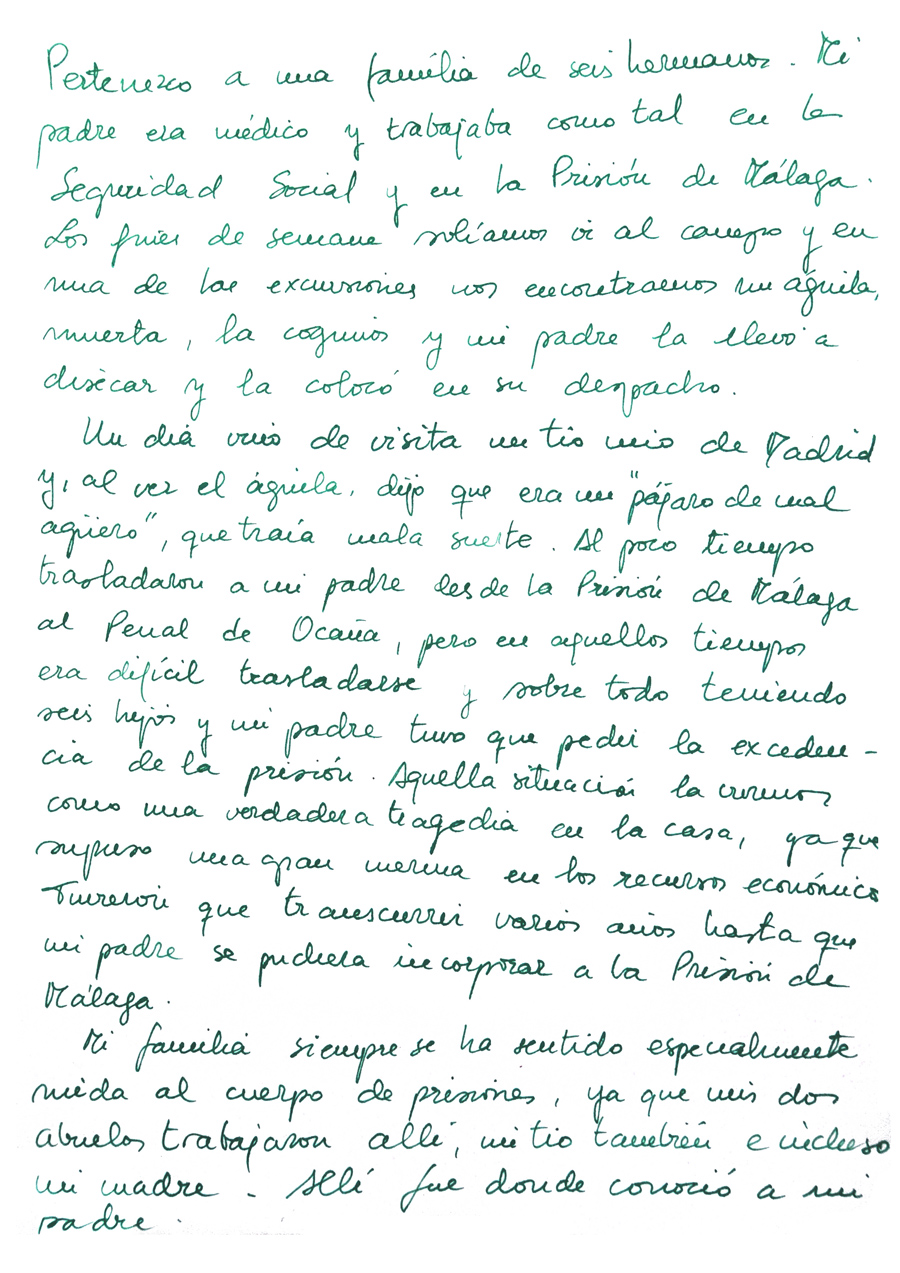 Pertenezco a una familia de seis hermanos. Mi padre era médico y trabajaba como tal en la Seguridad Social y en la Prisión de Málaga. Los fines de semana solíamos ir al campo y en una de las excursiones nos encontramos un águila muerta, la cogimos y mi padre la llevó a disecar y la colocó en su despacho. Un día vino de visita un tío mío de Madrid y, al ver el águila, dijo que era un "pájaro de mal agüero", que traía mala suerte. Al poco tiempo trasladaron a mi padre de la Prisión de Málaga al Penal de Ocaña. Pero en aquellos tiempos era difícil trasladarse y sobre todo teniendo seis hijos, así que mi padre tuvo que pedir la excedencia de la prisión. Aquella situación la vivimos como una verdadera tragedia en la casa, ya que supuso una gran merma en los recursos económicos. Tuvieron que pasar varios años hasta que mi padre se pudiera incorporar a la Prisión de Málaga.