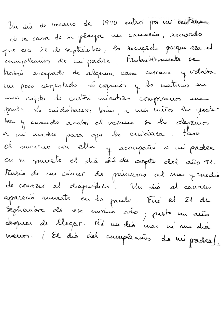Un día de verano de 1990 entró por la ventana de mi casa de la playa un canario. Recuerdo que era 21 de septiembre, lo recuerdo porque era el cumpleaños de mi padre. Probablemente se había escapado de alguna casa cercana y volaba un poco despistado. Lo cogimos y lo metimos en una cajita de cartón mientras comprábamos una jaula. Lo cuidábamos bién, a mis niños les gustaba y cuando acabó el verano se lo dejamos a mi madre para que lo cuidara. Pasó el invierno con ella y acompañó a mi padre en su muerte el día 22 de agosto del año 91. Murió de un cáncer de páncreas al mes y medio de conocer el diagnóstico. Un día el canario apareció muerto en su jaula. Fué el 21 de septiembre de ese mismo año, justo un año después de llegar. Ni un día más ni un día menos. ¡El día del cumpleaños de mi padre!.