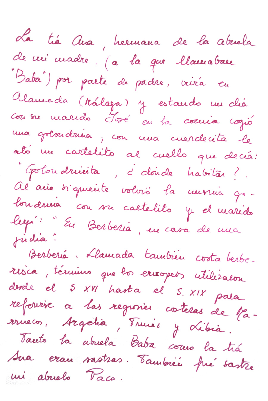 La tía Ana, hermana de la abuela de mi madre (a la que llamaban Baba), por parte de padre, vivía en Alameda (Málaga). Estando un día con su marido José en la cocina cogió una golondrina; con una cuerdecita le ató un cartelito al cuello que decía:"Golondrinita, ¿dónde habitas?". Al año siguiente volvió la misma glondrina con su cartelito y el marido leyó: "En Berbería, en casa de una judía". (Berbería, llamada también costa berberisca. Término que los europeos usaron desde el siglo XVI al siglo XIX para referirse a las zonas costeras de Marruecos, Argelia, Túnez y Libia). Tanto la abuela Baba como la tía Ana eran sastras. También fué sastre mi abuelo Paco.